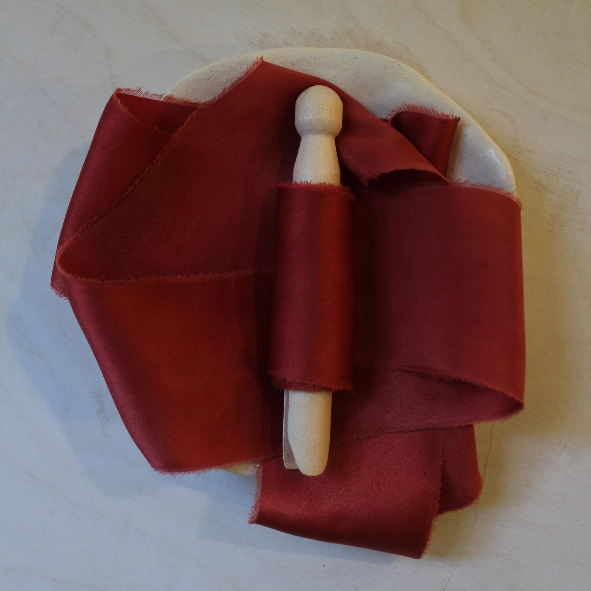 All of our silk ribbons are hand-dyed using natural dyes and are thoroughly washed before reaching you. Since the colors come directly from nature, each dye lot may vary slightly, and you may notice subtle differences or markings throughout the ribbon.