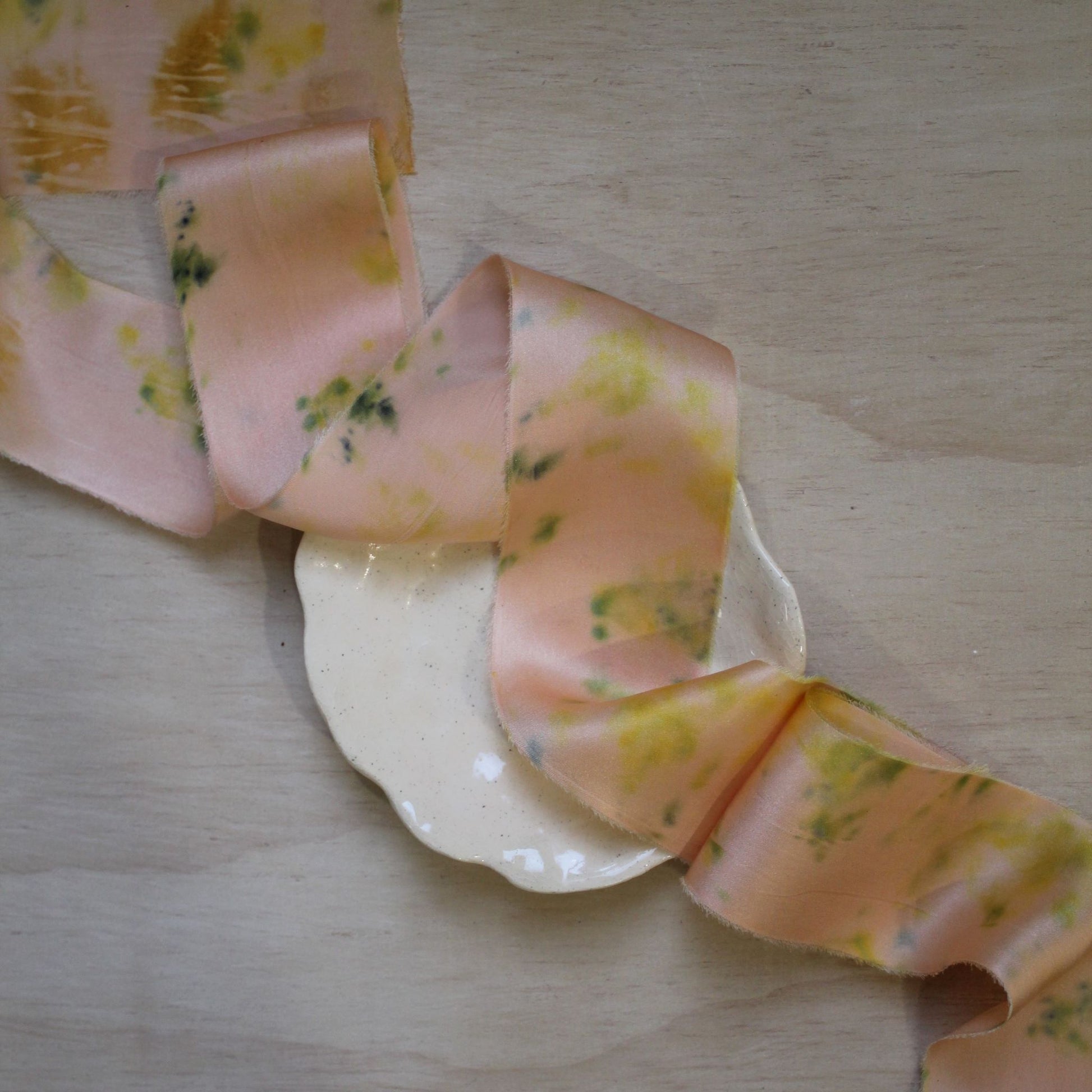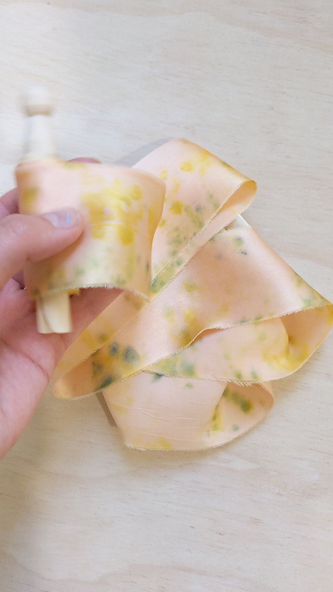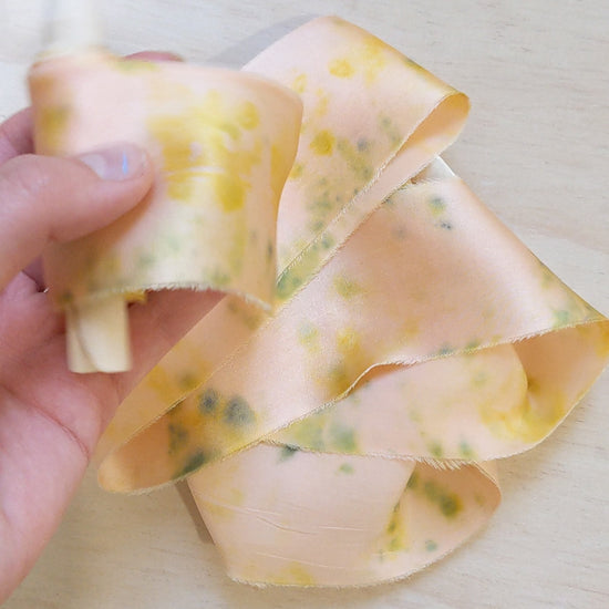 All of our silk ribbons are hand-dyed using natural dyes and are thoroughly washed before reaching you. Since the colors come directly from nature, each dye lot may vary slightly, and you may notice subtle differences or markings throughout the ribbon.