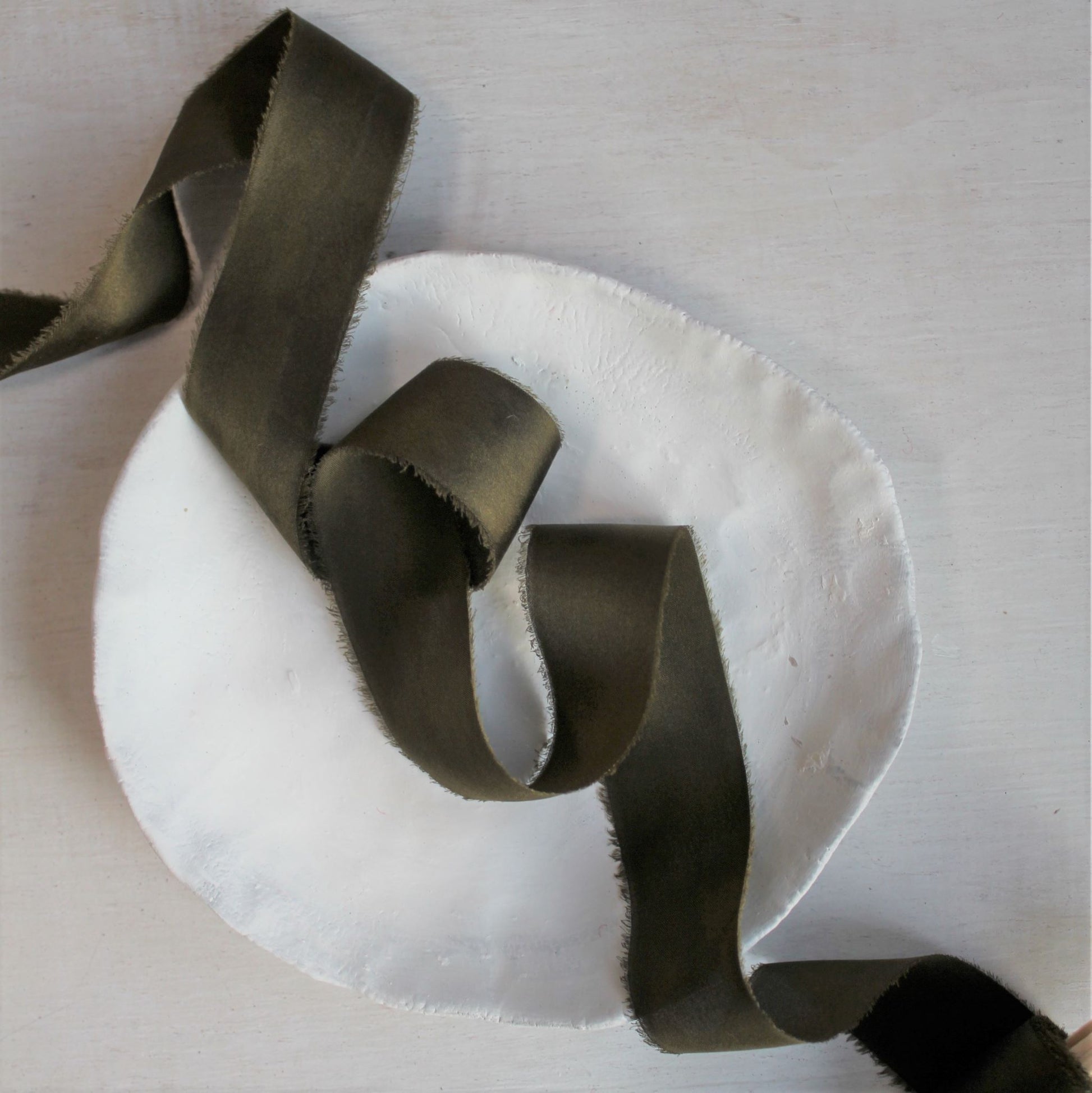 Dark MOSS is a rich, muted green with yellow undertones, dyed using onion skins. Please note that the current dye lot may differ slightly in brightness and may have natural dye markings throughout, making each ribbon unique.