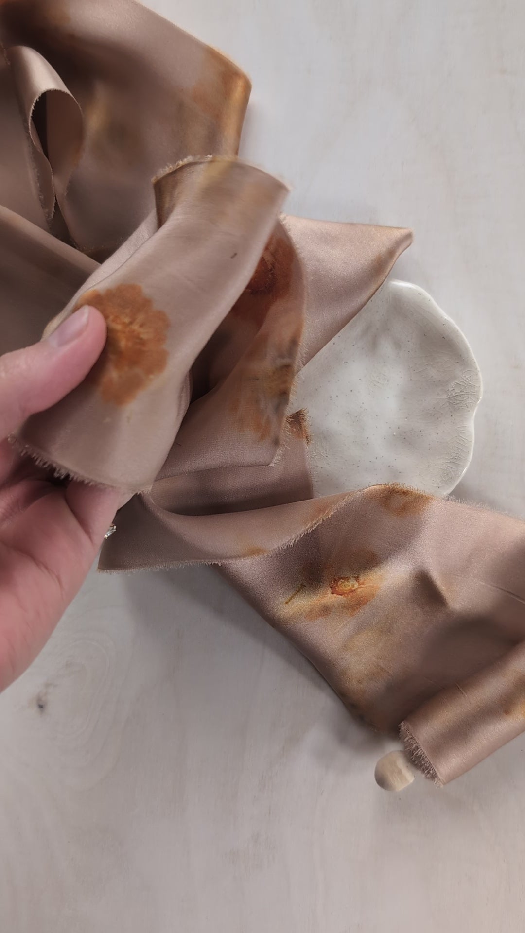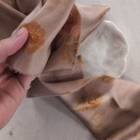All of our silk ribbons are hand-dyed using natural dyes and are thoroughly washed before reaching you. Since the colors come directly from nature, each dye lot may vary slightly, and you may notice subtle differences or markings throughout the ribbon.