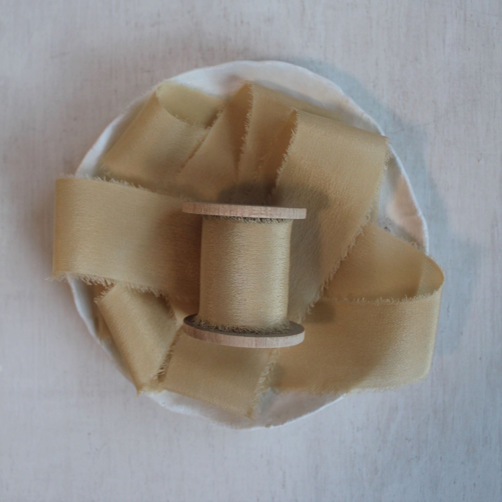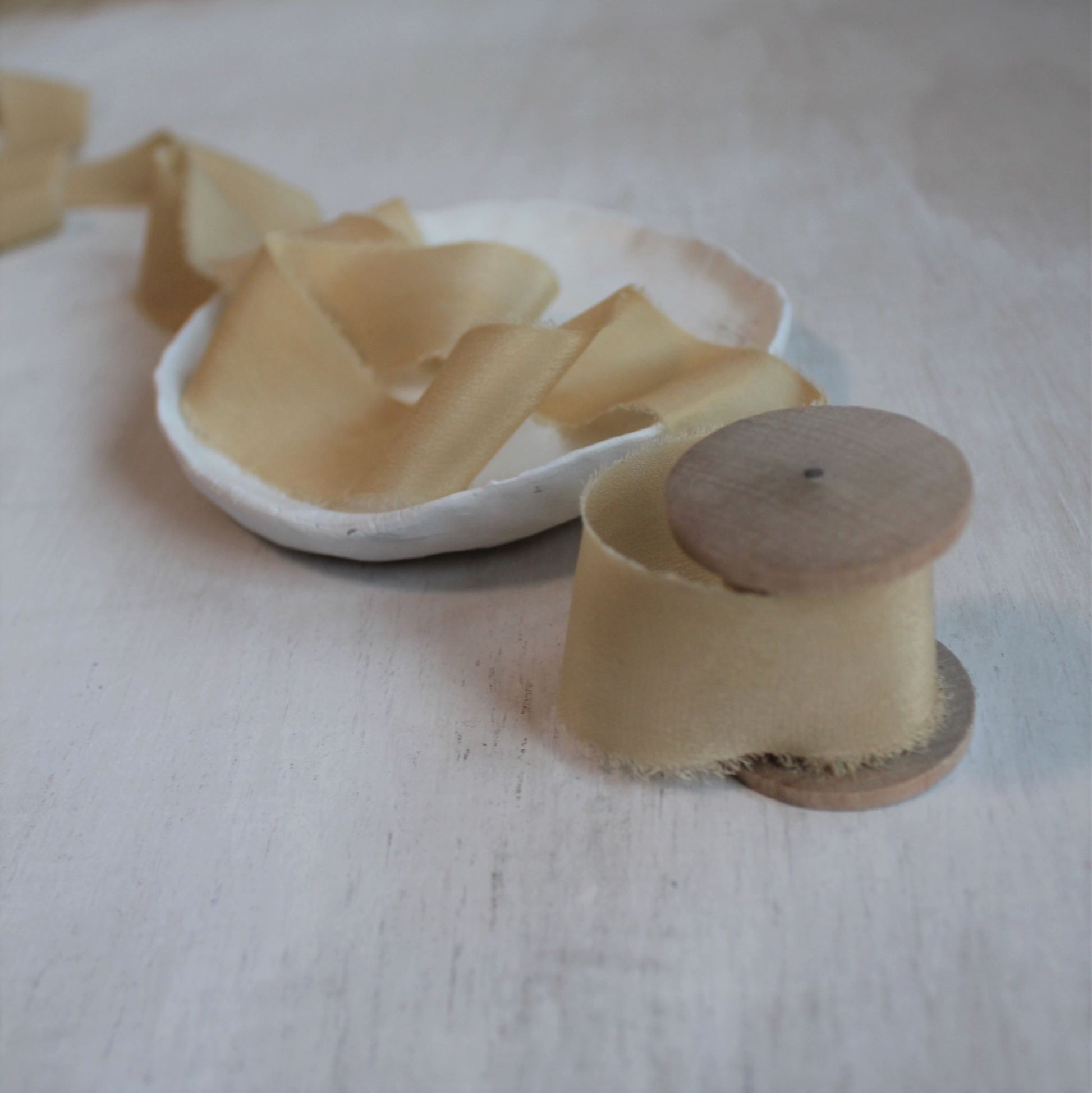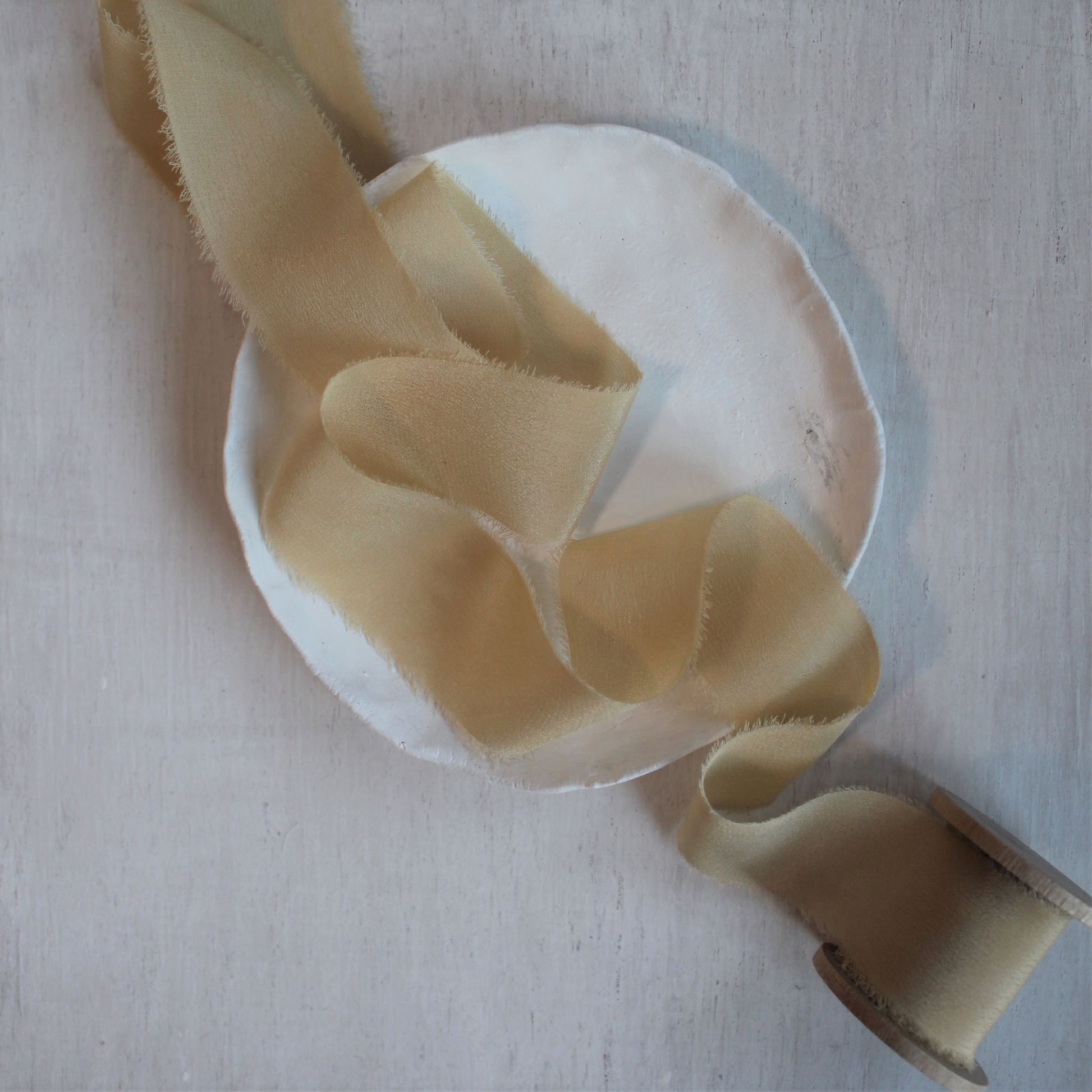 All of our silk ribbons are hand-dyed using natural dyes and are thoroughly washed before reaching you. Since the colors come directly from nature, each dye lot may vary slightly, and you may notice subtle differences or markings throughout the ribbon.