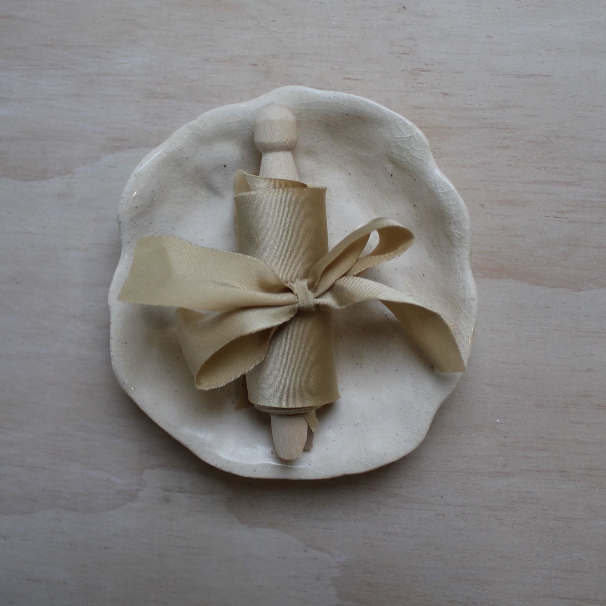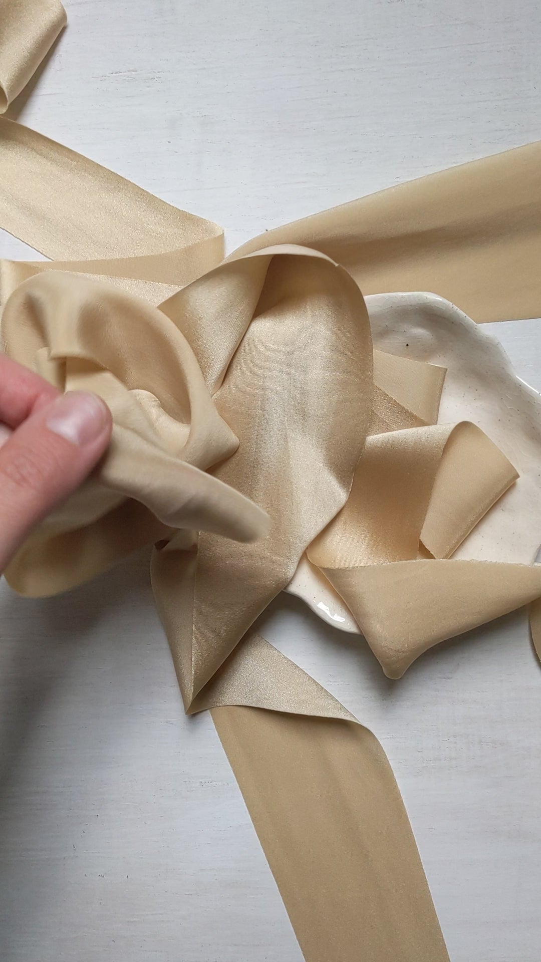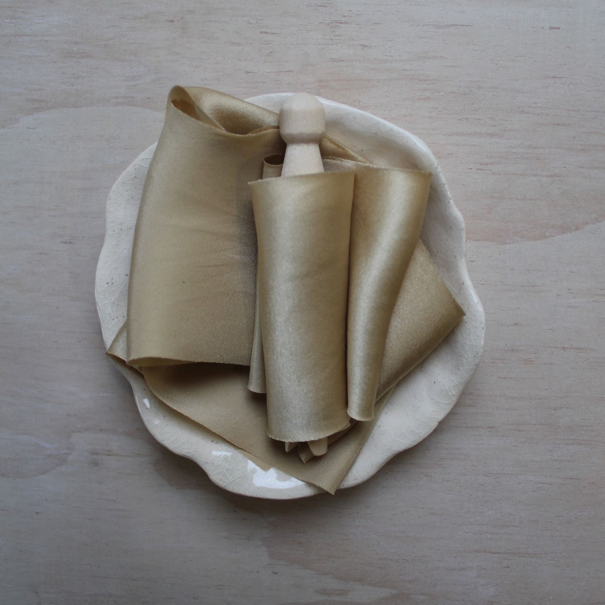All of our silk ribbons are hand-dyed using natural dyes and are thoroughly washed before reaching you. Since the colors come directly from nature, each dye lot may vary slightly, and you may notice subtle differences or markings throughout the ribbon.