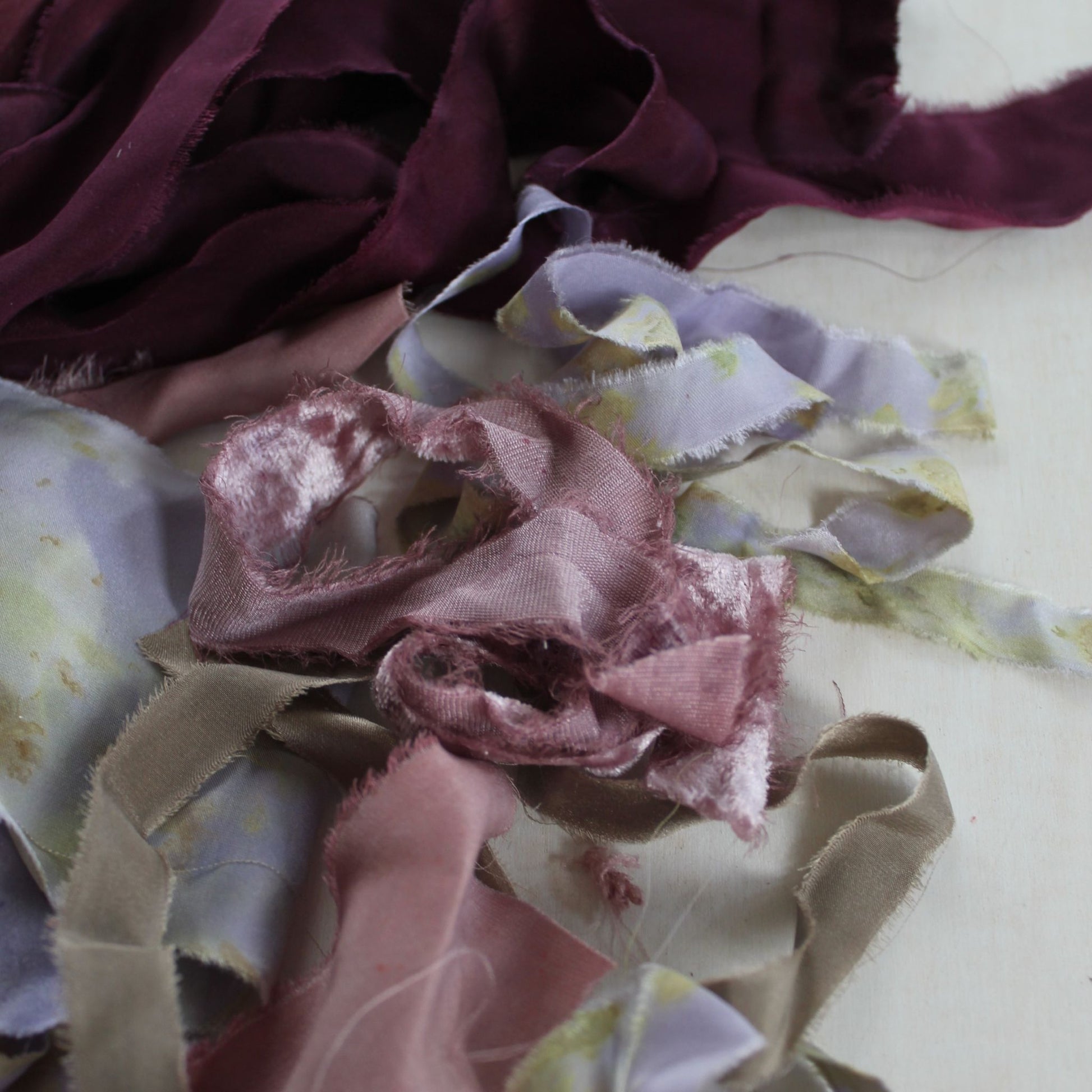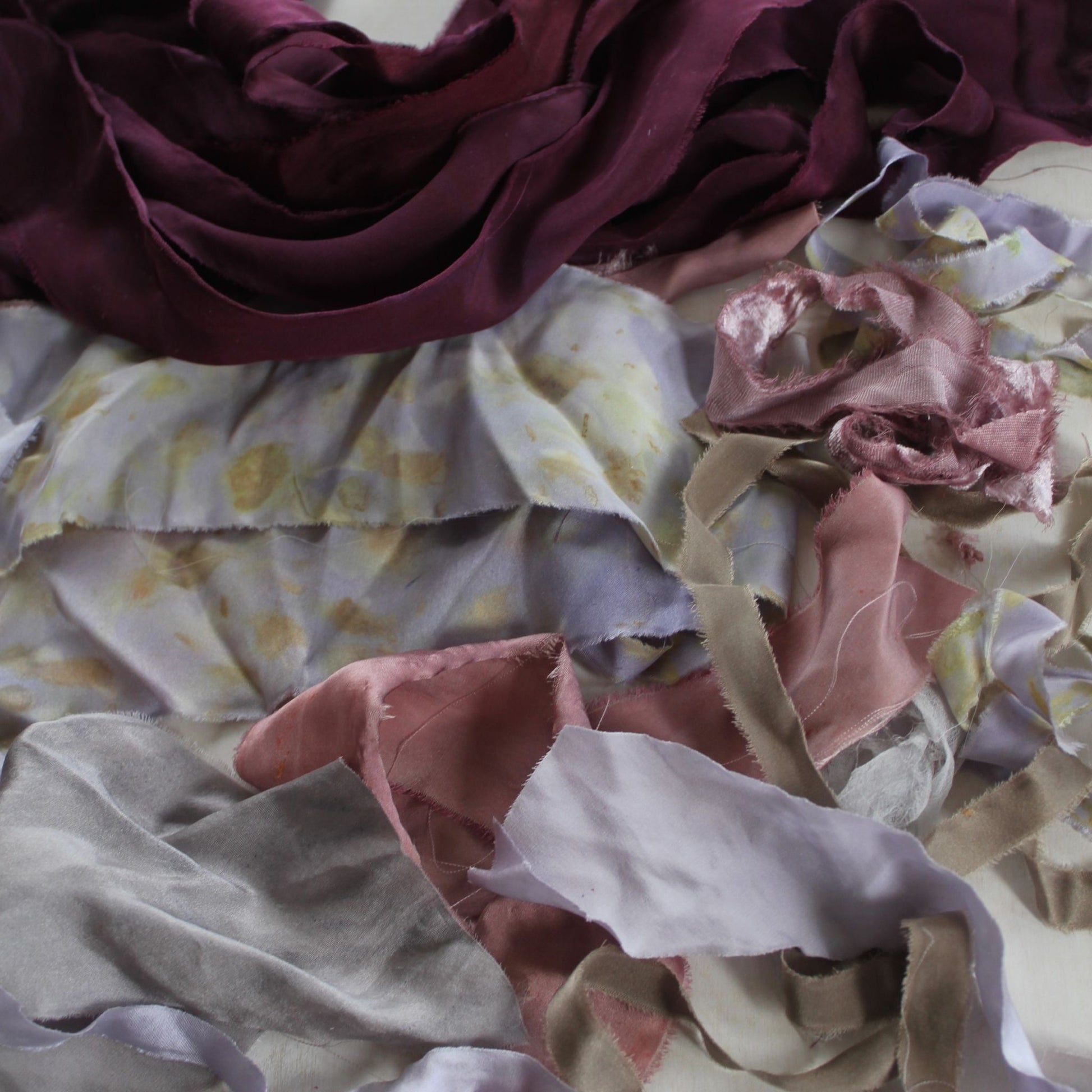 A mixed bundle of naturally dyed silk ribbon in a variety of luxurious silk types—mostly charmeuse