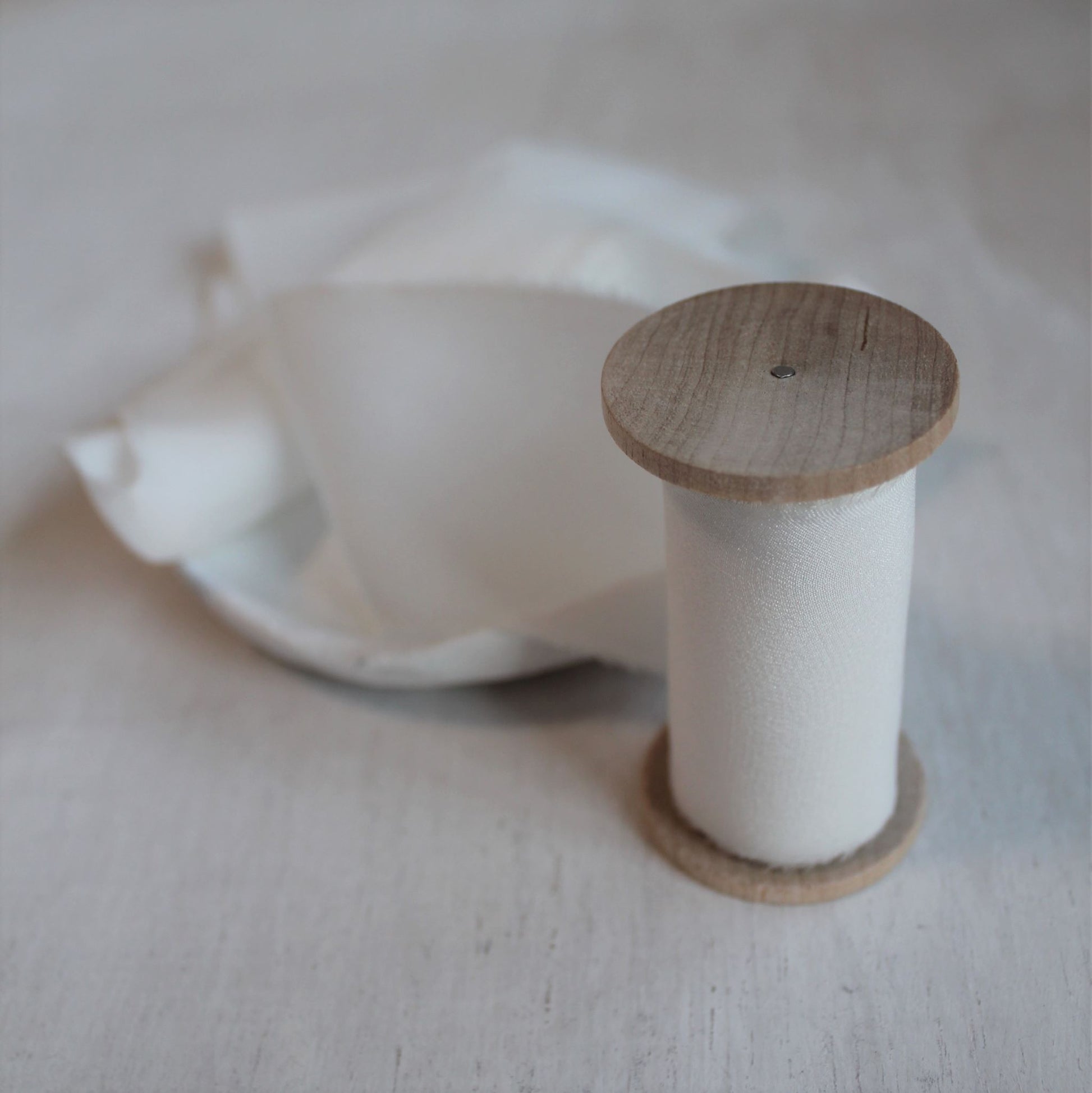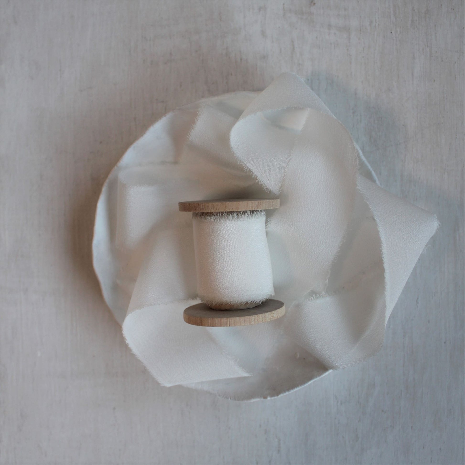 Elevate your wedding or creative projects with our White Silk Crepe de Chine Ribbon. This hand-torn ribbon features a classic white hue, offering a timeless and elegant aesthetic. Crafted from 100% silk and naturally dyed, each ribbon showcases unique variations, embodying the beauty of artisanal craftsmanship.