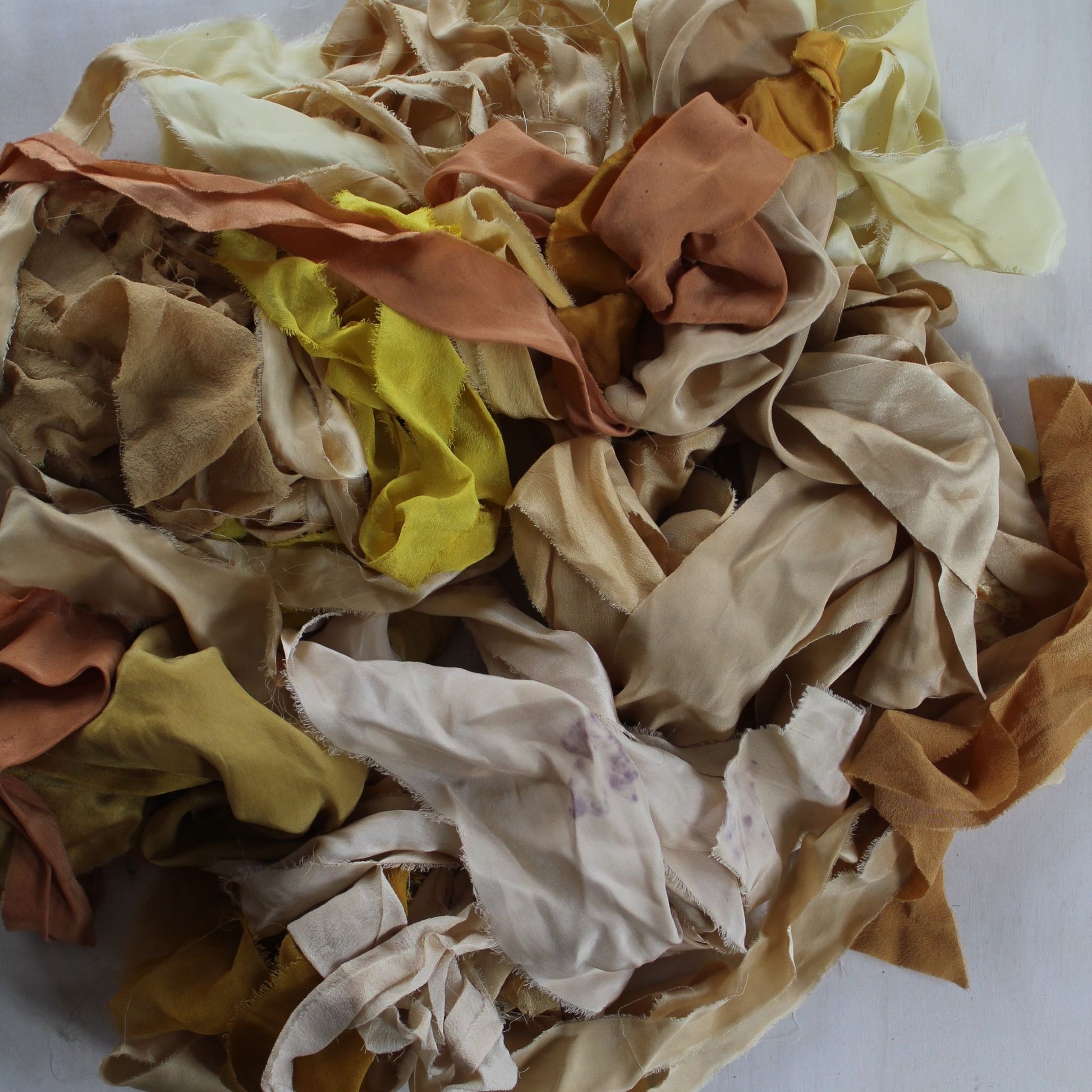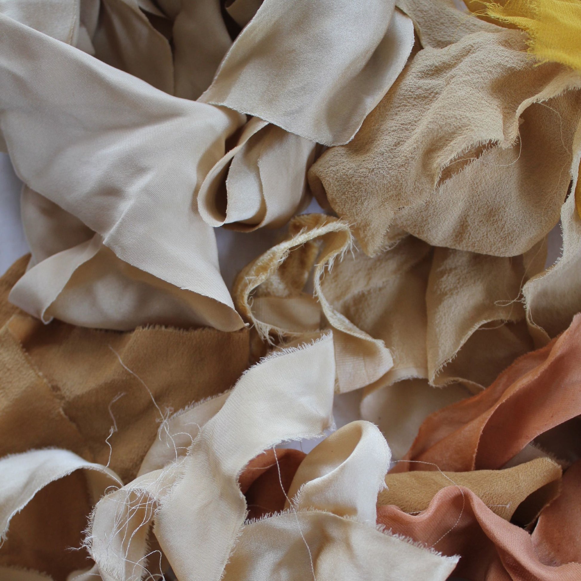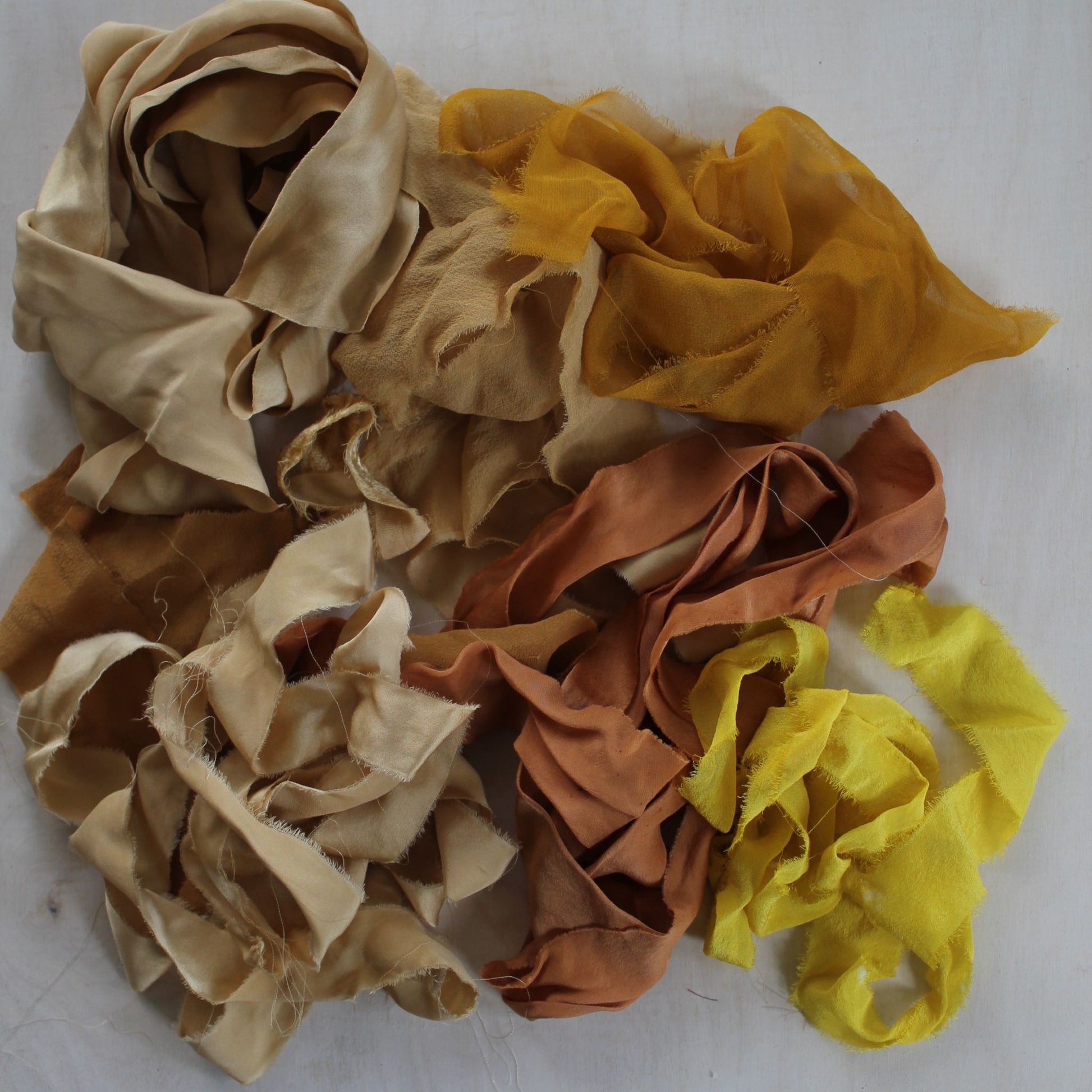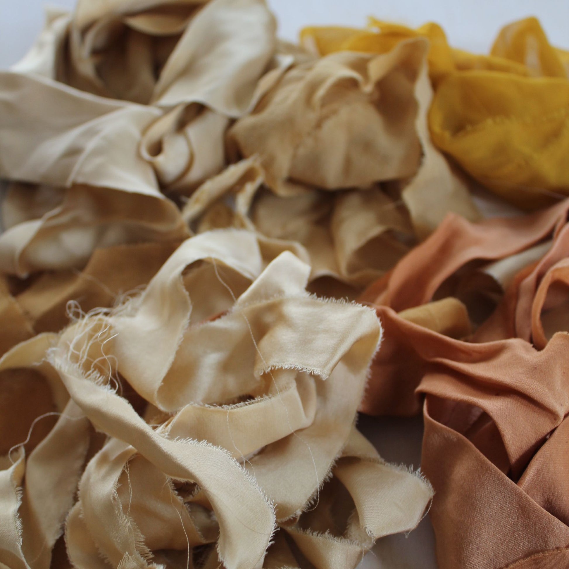 A mixed bundle of naturally dyed silk ribbon in a variety of luxurious silk types—including Charmeuse, Crepe de Chine, and Chiffon.
