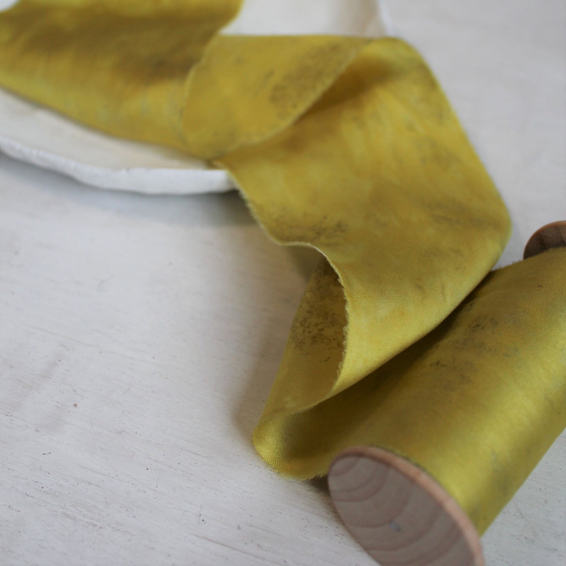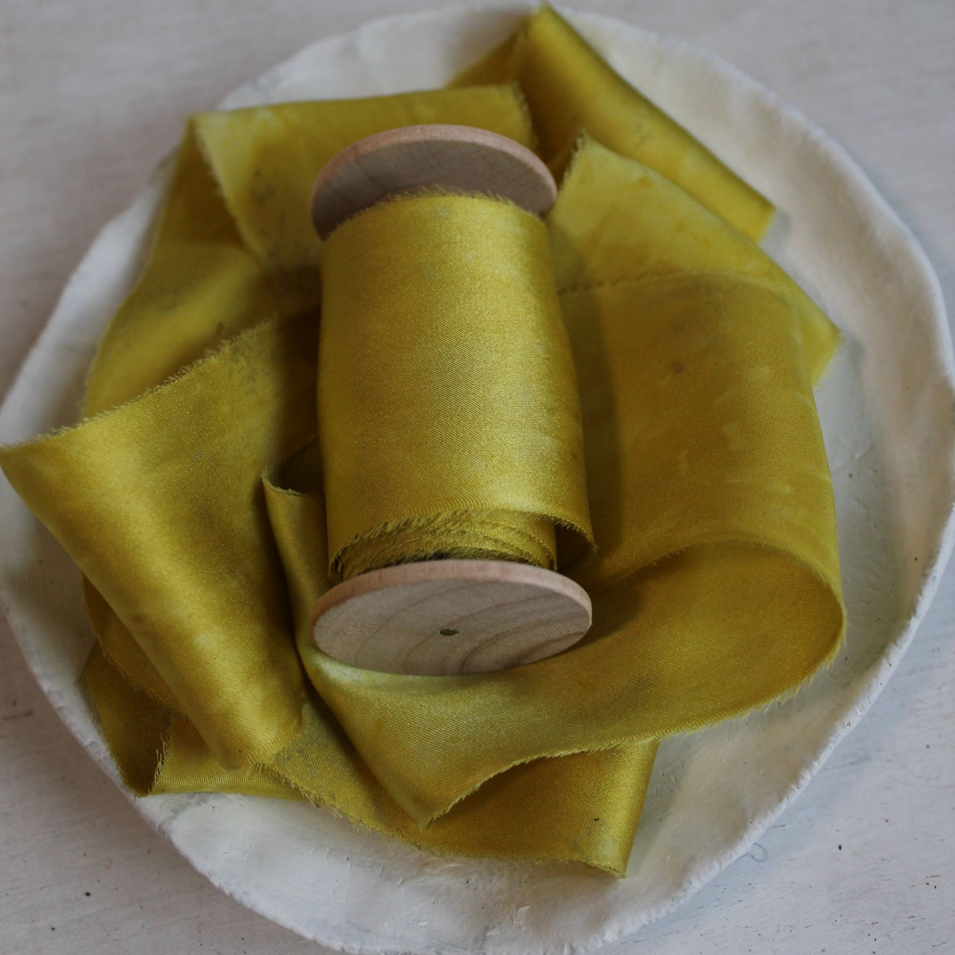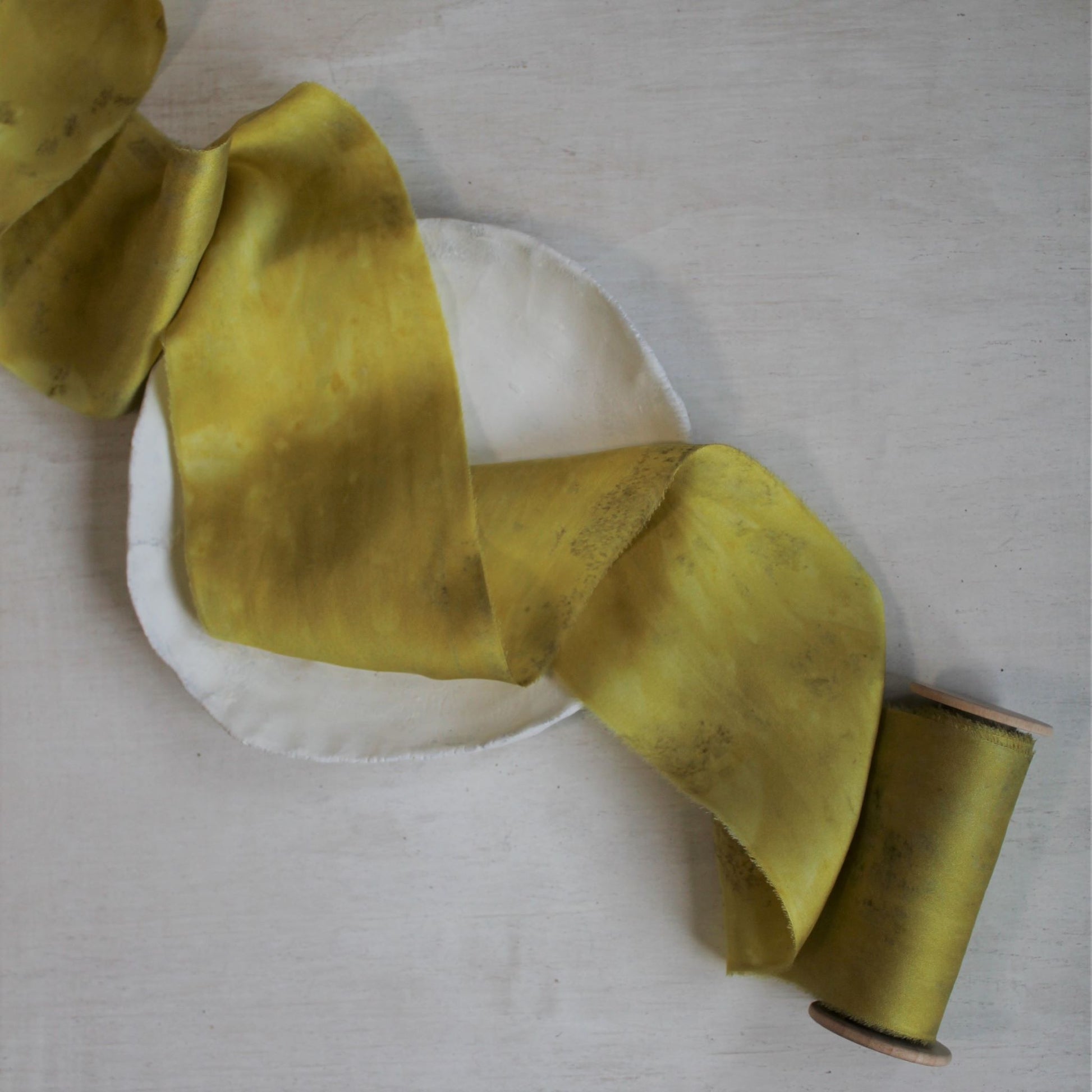 YELLOW is bundle dyed silk ribbon that has a naturally dyed print on it, making it extra unique