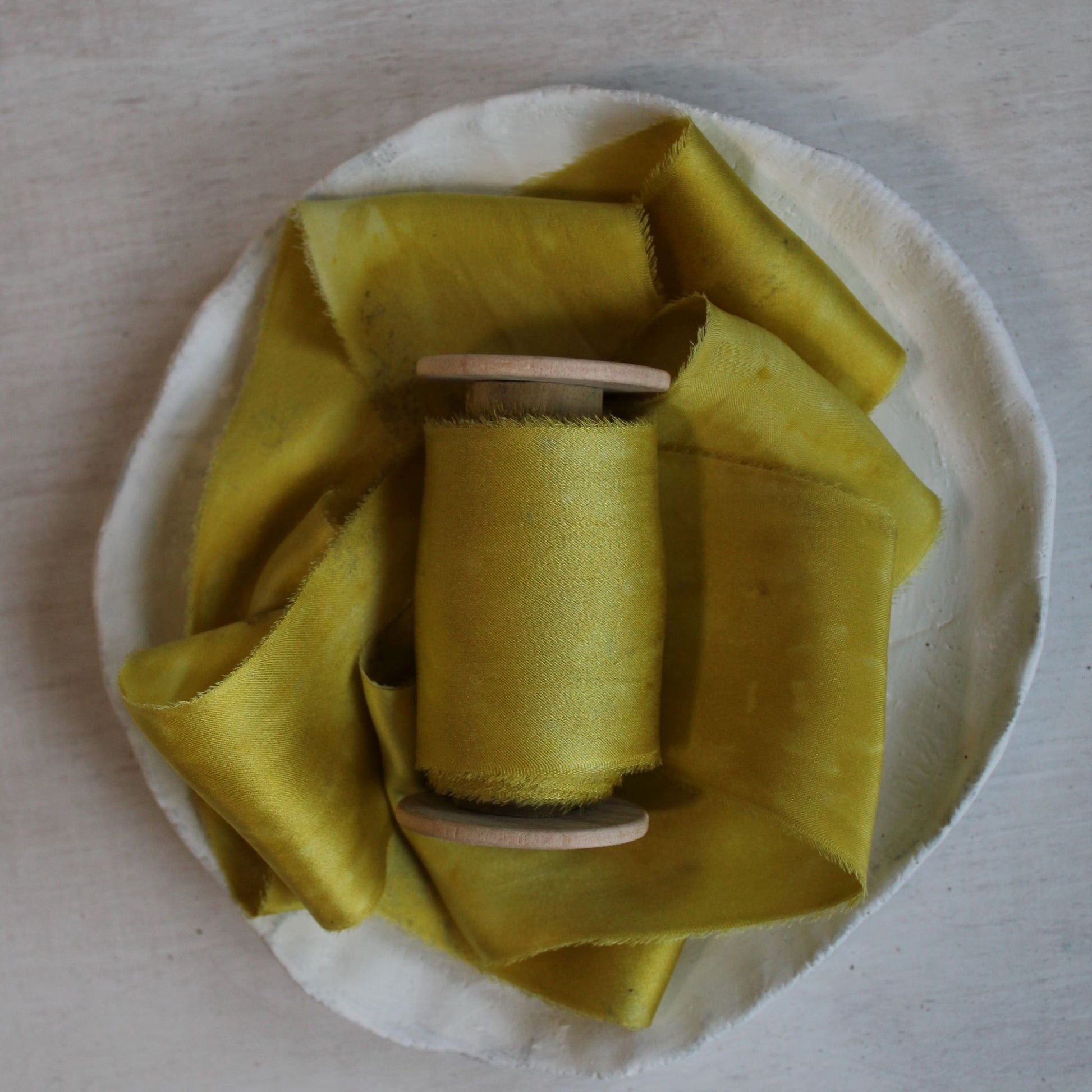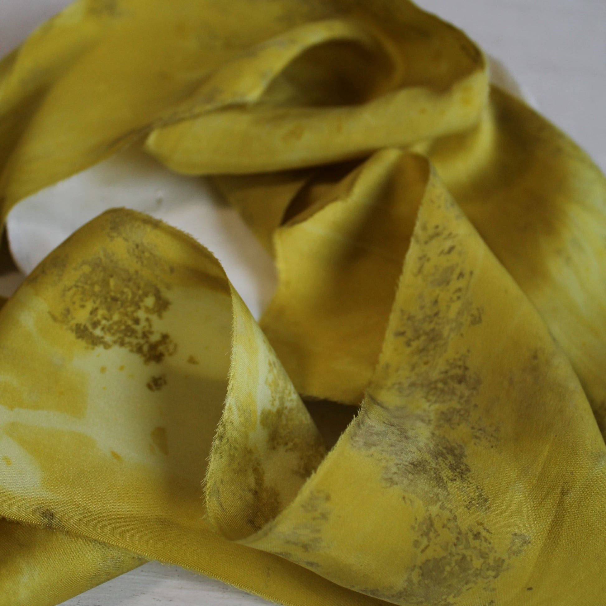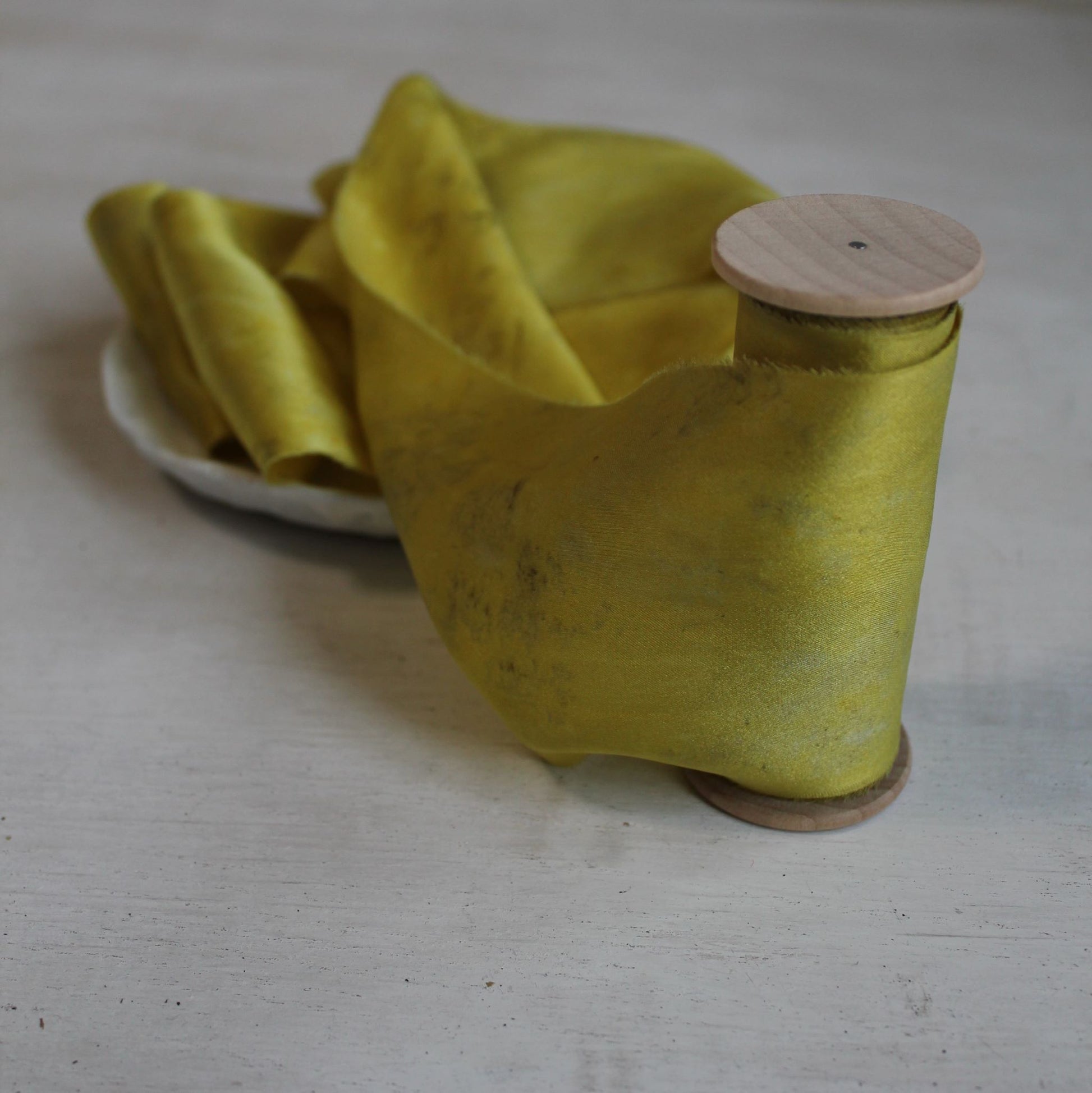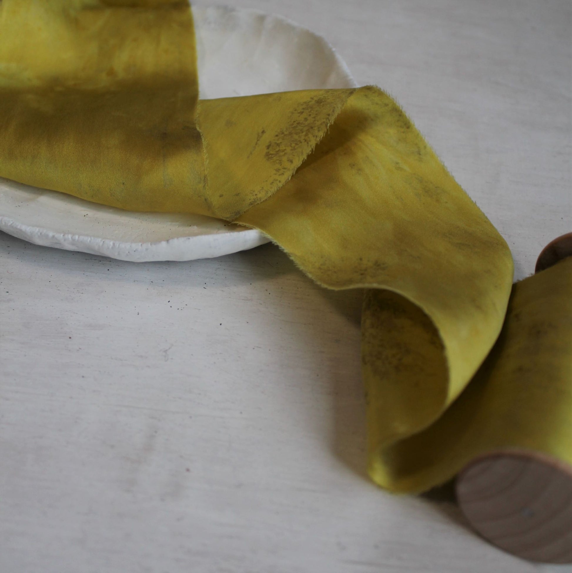 YELLOW is bundle dyed silk ribbon that has a naturally dyed print on it, making it extra unique